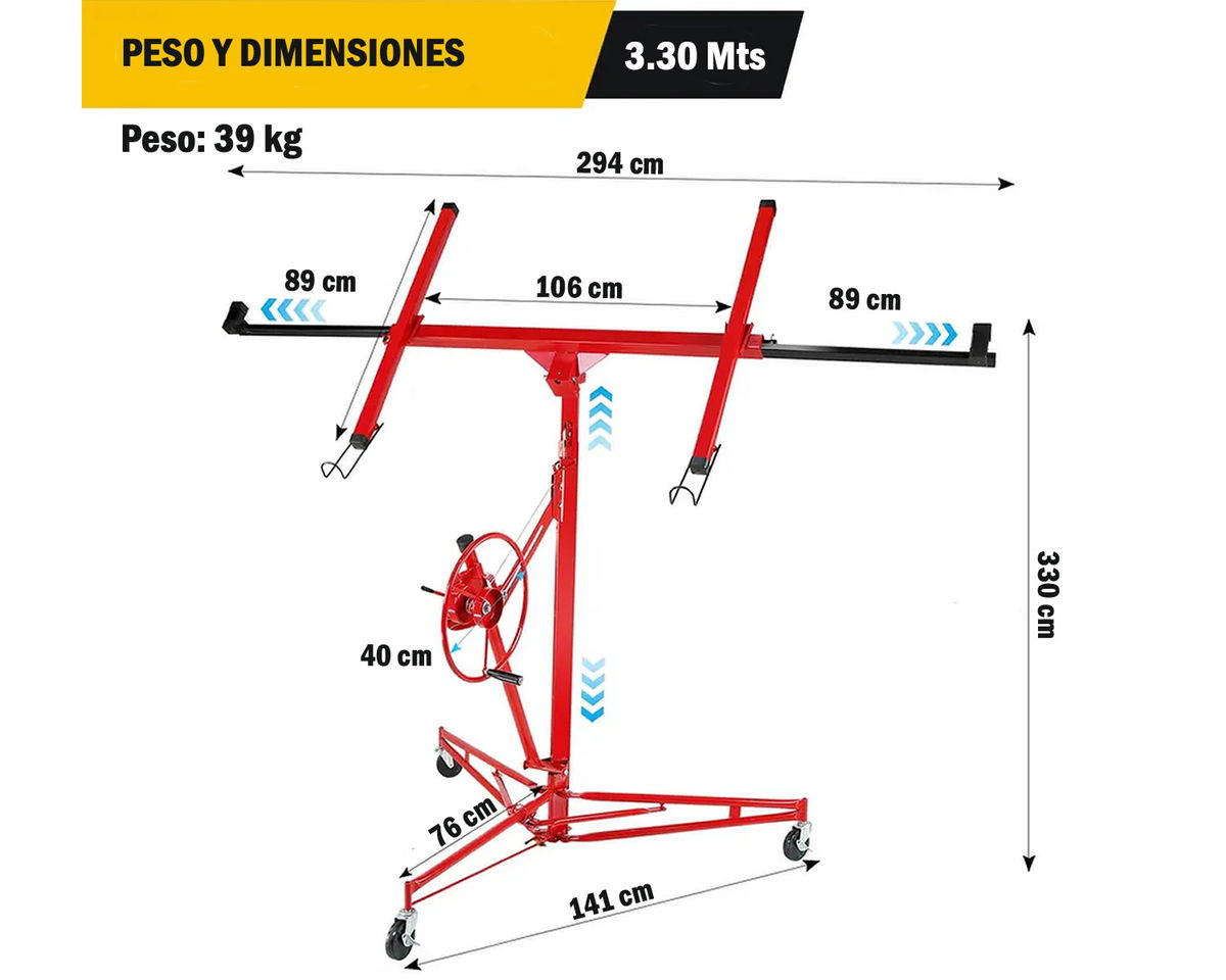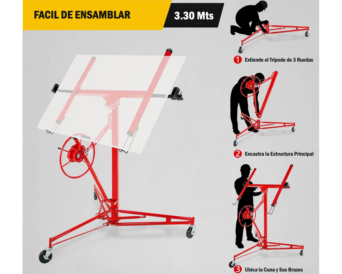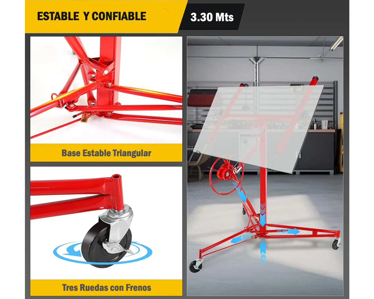 El Elevador de Placa Durlock de la marca Technik es la herramienta ideal para quienes buscan eficiencia y comodidad en sus proyectos de construcción en seco. Con una altura de 3.35 metros, este modelo está diseñado específicamente para facilitar el manejo de placas de yeso, permitiendo un trabajo más ágil y seguro.